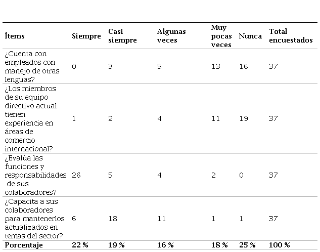 Fuente: elaboración propia.Según los resultados de la Tabla 6, se observa que el mayor porcentaje de dicho indicador representa un 25 %, esto se debe a que los miembros del equipo directivo actual de las mipymes nunca tienen experiencia en áreas de comercio internacional. El 18 %, muy pocas veces cuenta con empleados con manejo de otras lenguas. El 16 %, algunas veces capacita a sus colaboradores para mantenerlos actualizados en temas del sector. Un punto a favor es que el 22 % de las mipymes siempre evalúa las funciones y responsabilidades de sus colaboradores.