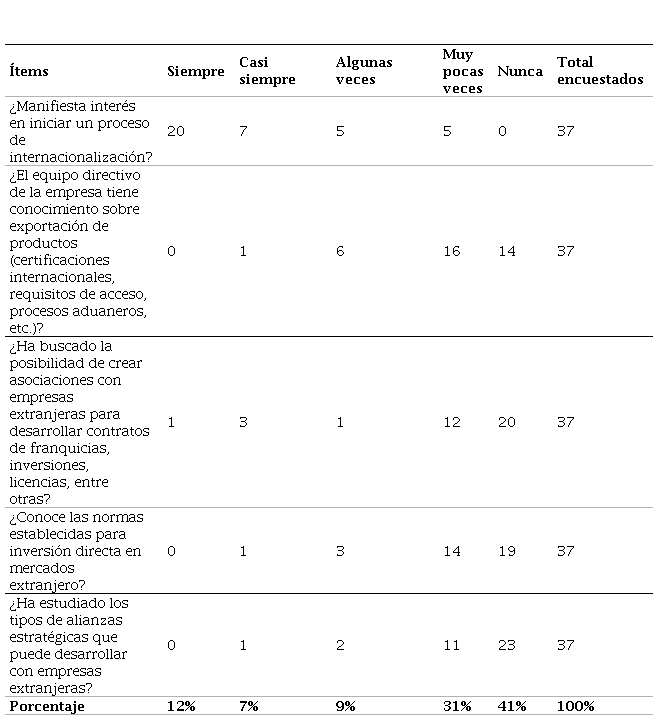 Fuente: elaboración propia.En la Tabla 8 se puede observar que el porcentaje mayor de este indicador representa un 41 %, lo cual indica que las empresas nunca han estudiado los tipos de alianzas estratégicas que puede desarrollar con empresas extranjeras. El 31 %, muy pocas veces tiene conocimiento sobre exportación de productos (certificaciones internacionales, requisitos de acceso, procesos aduaneros, etc.). El 9 %, algunas veces conoce las normas establecidas para inversión directa en mercados extranjero. El 7 %, casi siempre ha estudiado los tipos de alianzas estratégicas que puede desarrollar con empresas extranjeras. Y el 12 % manifiesta interés en iniciar un proceso de internacionalización.