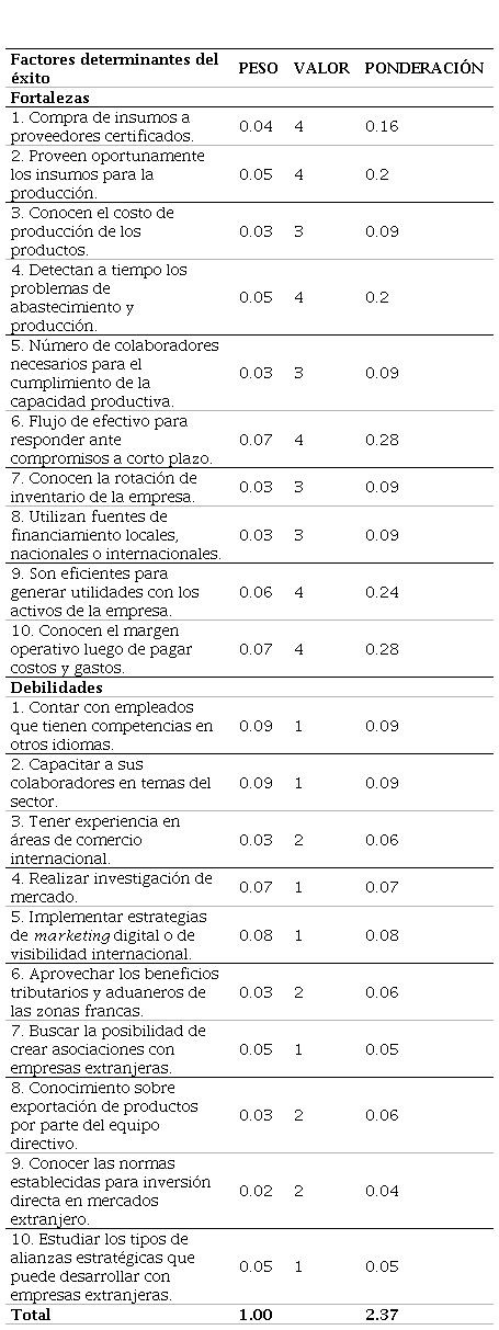 Fuente: elaboración propia.Table 12. Analysis of the weighting of external and internal factors
