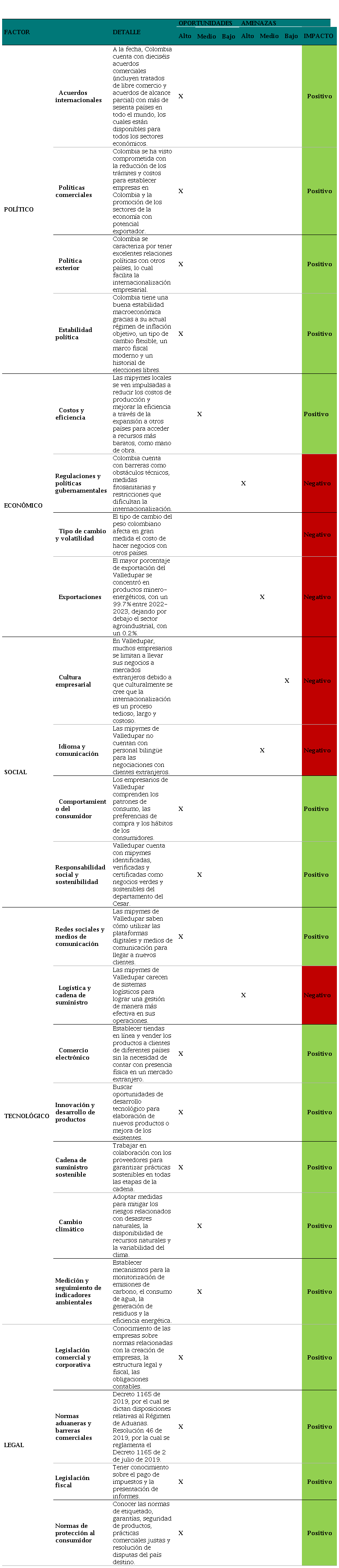 Para evaluar los factores externos se desarrolló un análisis PESTEL que resume y evalúa la información política (P), económica (E), social (S), tecnológica (T), ecológica (E) y legal (L) del entorno general de las mipymes agroindustriales. En el caso específico del factor político, se tuvieron en cuenta acuerdos internacionales, políticas comerciales, política exterior y estabilidad política; en factor económico, costos y eficiencia, regulaciones y políticas gubernamentales, tipo de cambio y volatilidad y exportaciones; en lo social, cultura empresarial, idioma y comunicación, comportamiento del consumidor, responsabilidad social y sostenibilidad; en tecnológico, redes sociales y medios de comunicación, logística y cadena de suministro, comercio electrónico, innovación y desarrollo de productos; en ecológico, cadena de suministro sostenible, cambio climático, medición y seguimiento de indicadores ambientales; y en legal, legislación comercial y corporativa, normas aduaneras y barreras comerciales, legislación fiscal y normas de protección al consumidor.
