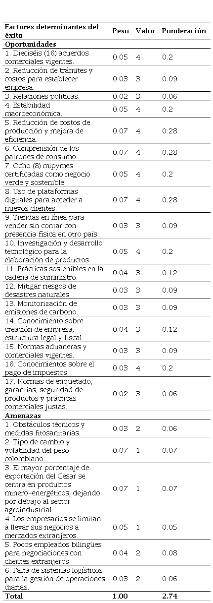 Fuente: elaboración propia.La Tabla 11 muestra los resultados de la MEFE donde se identifican las oportunidades y amenazas de las mipymes del sector agroindustrial de Valledupar frente a un proceso de internacionalización.