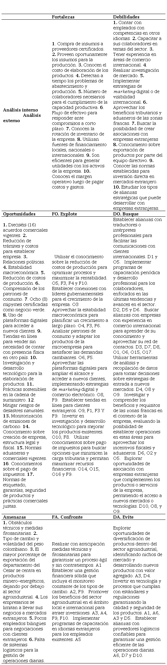 Fuente: elaboración propia.Table 13. SWOT matrix for agro-industrial MSMEs in Valledupar