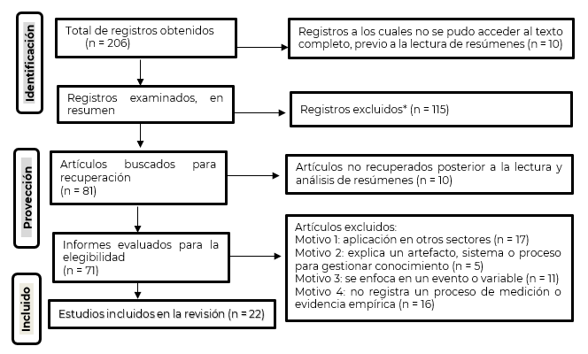 Se realizó la revisión de los resúmenes de los estudios relevantes, con el fin de identificar los avances que existen en el sector con respecto al capital intelectual y la gestión del conocimiento y su relación con competitividad y productividad, reportando los resultados desde directrices PRISMA. El análisis de los artículos se realizó a partir de la codificación, utilizando N-vivo para identificar los elementos de competitividad y productividad que permitan la relectura y su articulación con otras variables como los impulsores, las limitantes y los beneficios resultado de la gestión del conocimiento y el capital intelectual.