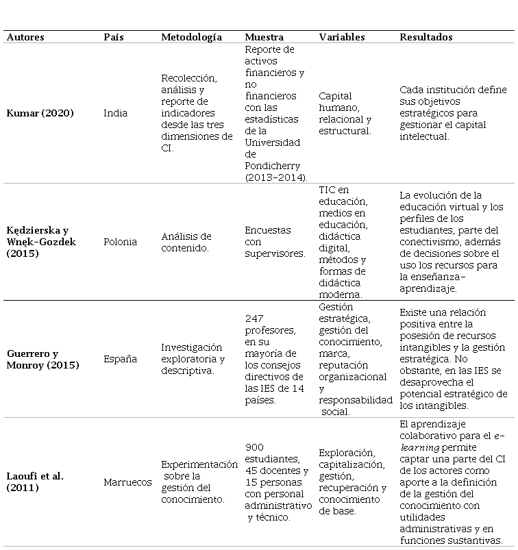Por otra parte, Kędzierska y Wnęk-Gozdek (2015), a partir del análisis de contenido y las encuestas, analizan el rol de la tecnología en la gestión del conocimiento con resultados en el incremento de CI, asociado a los cambios en el sector para el mejoramiento de los procesos de enseñanza-aprendizaje, aportando a la discusión sobre cómo la gestión del conocimiento y CI afectan a los procesos de producción e intercambio de conocimiento académico (Quarchioni et al., 2022, p. 10) y su relación con las tecnologías de la información y la comunicación (Gârdan et al., 2018, p. 656).