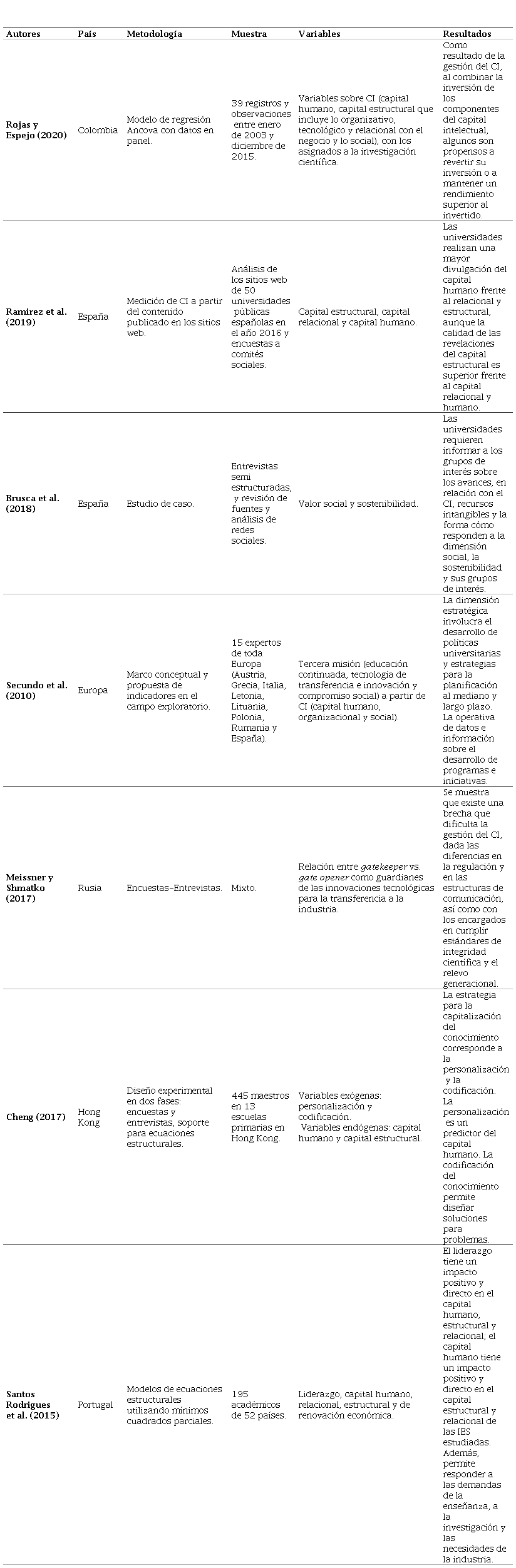Los artículos fueron analizados desde aspectos como los autores, la muestra utilizada, la metodología, las variables de análisis y los resultados obtenidos, en donde se mencionan la competitividad y productividad como el resultado de gestionar el conocimiento y realizar la medición del capital intelectual en la educación, sin excluir los niveles de formación o la naturaleza de la institución.