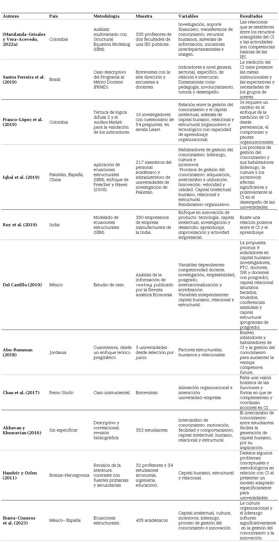 Fuente: elaborado a partir de Abu-Rumman (2018); Akhavan y Khosravian (2016); Chau et al. (2017); Del Castillo (2019); Santos Ferreira et al. (2019); Franco-López et al. (2019); Handzic y Ozlen (2011); Ibarra-Cisneros et al. (2023); Iqbal et al. (2019); Marulanda-Grisales y Vera-Acevedo (2022a); Roy et al. (2019).4. DISCUSIÓN