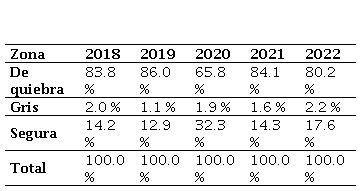 (9)Siendo e el número de Euler con un valor de 2.7182818284. Para el análisis de los resultados del modelo Zavgren, se utilizan las tres zonas de quiebras definidas para su clasificación (Stankevičienė y Prazdeckaitė, 2021):
