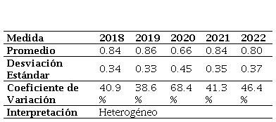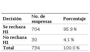 Teniendo en cuenta que son 5 años de análisis, se puede afirmar que n < 30. Por lo tanto, se propone la prueba de t de student para la validación de la hipótesis, en la que el nivel de confianza es del 5 % (α = 5 %), con n–1 GL. Por lo tanto, valor de no rechazo de H1 será si t < - 2.1318. A partir de lo anterior se aplica lo planteado en la ecuación (11)