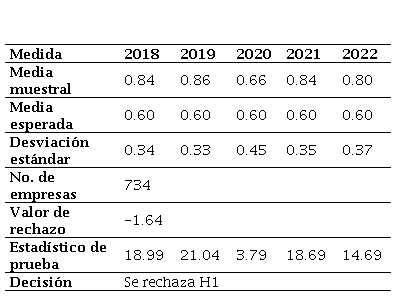 El nivel de confianza para la validación de la hipótesis es del 5 % (α = 5 %). Por lo tanto, el valor de no rechazo de H1 será si Z < - 1.64. Con base en lo anterior se aplica lo descrito en la ecuación (10)