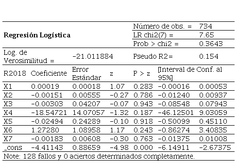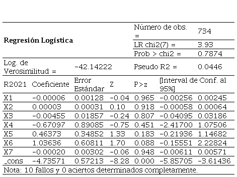 En los resultados del modelo 2021, se observa una continuidad en la tendencia de los años anteriores (2018, 2019 y 2020), las variables X1 a X7 no muestran significancia estadística en su influencia sobre la probabilidad de insolvencia (ver Tabla 17).