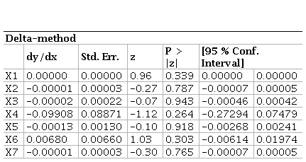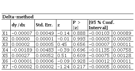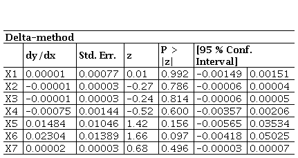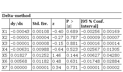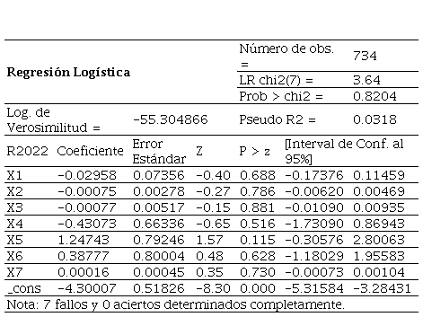 Fuente: elaboración propia.Los cambios marginales en 2021 indican que, aunque hay variaciones en las probabilidades asociadas con cada variable, estas no son suficientemente robustas para ser consideradas predictivas de la insolvencia. Las disminuciones marginales en la probabilidad de insolvencia asociadas con un aumento en X1, X3, X4 y X7 (-0.0000006, -0.0000484, -0.0071462 y -0.00000208 respectivamente) y los incrementos asociados con X2, X5 y X6 (0.000000342, 0.004939 y 0.0110379), aunque indican una tendencia, tienen niveles de significancia (0.965, 0.807, 0.465, 0.214, 0.128 y 0.948) que plantean una falta de robustez estadística. Al comparar estos resultados con los modelos anteriores, se observa una consistencia en la falta de significancia y en la magnitud limitada de los cambios marginales.