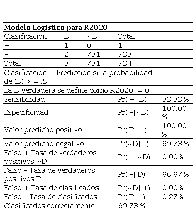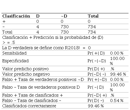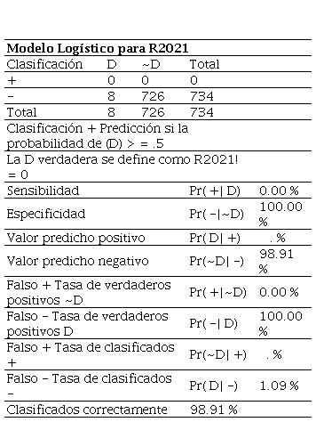 Fuente: elaboración propia.A diferencia del modelo de 2020, que logró identificar un verdadero positivo, el modelo de 2021 no identificó ningún verdadero positivo (0), lo que resulta en una sensibilidad del 0 %. Esta falta de capacidad para detectar insolvencias, junto con la ausencia de falsos positivos (0) y una especificidad del 100 %, indica que el modelo es altamente eficaz en clasificar empresas sólidas, pero falla identificar las empresas en riesgo. La cantidad de falsos negativos (8)ha aumentado en comparación con años anteriores, lo que refleja una disminución en la precisión del modelo, evidenciada por un valor predictivo negativo del 98.91 % y una tasa de clasificación correcta del 98.91 %. Este retroceso en la capacidad predictiva, en comparación con una mejora leve en 2020, sugiere una inconsistencia en la eficacia del modelo a lo largo de los años.
