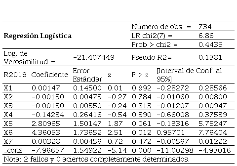 Table 19. Logistic regression results for the probability of insolvency in the Colombian construction industry (2022)
