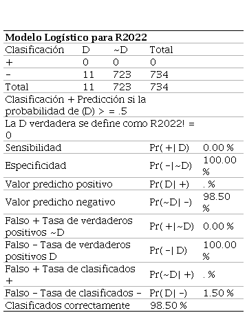 Los resultados de la matriz de confusión del modelo estimado para el año muestran un patrón consistente con los años anteriores (2018-2021), destacando una vez más las limitaciones en la capacidad predictiva del modelo (ver Tabla 21). Al igual que en los modelos anteriores, el modelo de 2022 no logró identificar ningún verdadero positivo (0), manteniendo una sensibilidad del 0 %. Esta constante incapacidad para detectar empresas insolventes, junto con una especificidad del 100 % (debido a la ausencia de falsos positivos), indica que el modelo es eficaz en clasificar empresas financieramente sólidas, pero falla en identificar aquellas en riesgo de insolvencia.