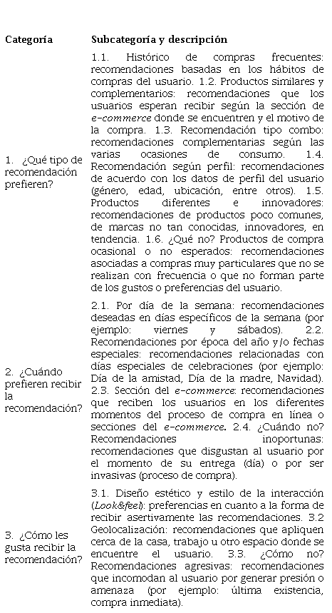 El análisis sobre las preferencias de los adultos jóvenes acerca de los sistemas de recomendación en e-commerce arrojó trece subcategorías, agrupadas en las tres categorías principales como se muestra en la Tabla 1.