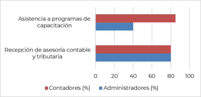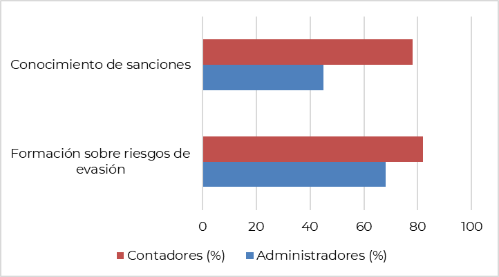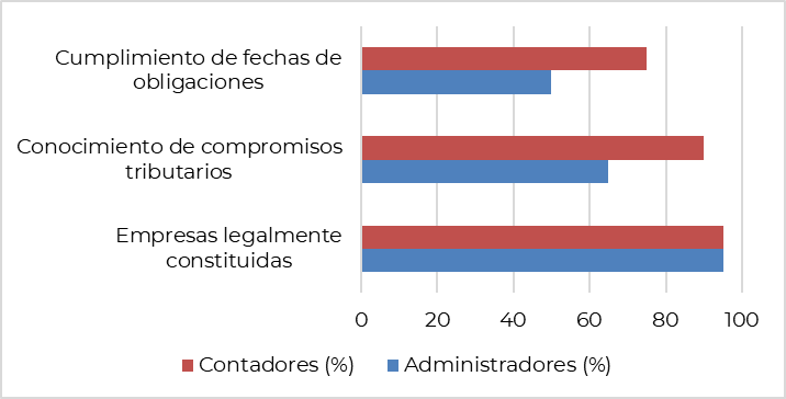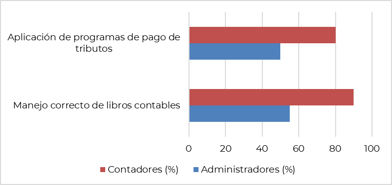Fuente: elaboración propia.La Tabla 1 muestra una serie de evidencias que darán luz a las diferencias entre administradores y contadores, una de las principales la brecha de conocimientos alrededor de los compromisos tributarios, lo que guarda relación con ciertas acciones concretas como el cumplimiento con los plazos legales, la asistencia a capacitaciones y la participación activa en las mismas; esta serie de hallazgos pueden respaldar estudios anteriormente mencionados como el de la oecd (2022), puesto que vinculan la formación continua con la disminución de tasas de evasión.