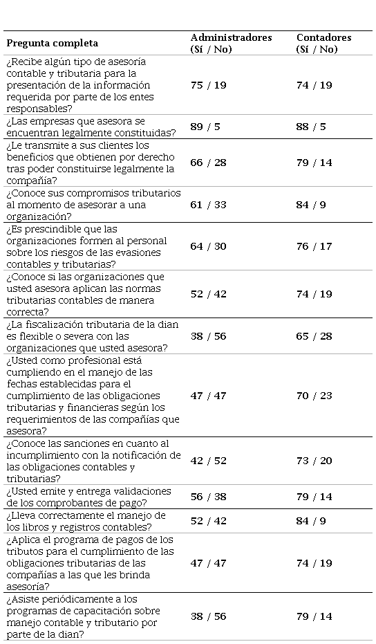 La encuesta se diseñó para evaluar el conocimiento y el cumplimiento de las obligaciones contables y tributarias de administradores y contadores públicos en Aguachica, Cesar. La Tabla 1 muestra los resultados de la aplicación de la encuesta; a partir de ahí se puede evidenciar una marcada diferencia entre administradores y contadores públicos en una serie de aspectos clave.