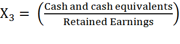 (2)Variable X3 measures liquidity by comparing cash and cash equivalents to retained earnings from the most recent period. A higher value suggests that greater liquidity relative to earnings reduces the risk of insolvency. The calculation structure for X3 is displayed in Equation (3)
