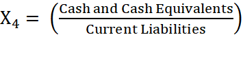 (3)Variable X4 represents the ratio of cash and cash equivalents to current liabilities (short-term obligations), which indicates the firm’s ability to meet immediate obligations using its most liquid assets. The calculation structure for X4 is exhibited in Equation (4)