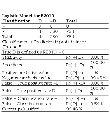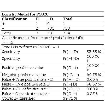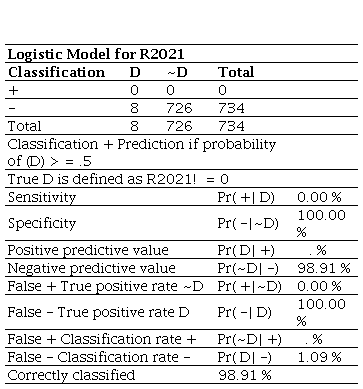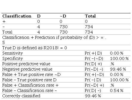 Source: Own work.Unlike the 2020 model, which identified one true positive, the 2021 model detected none, yielding 0% sensitivity. This inability to detect insolvency, combined with the absence of false positives and 100% specificity, indicates that the model is highly effective at classifying solvent firms but fails to identify those at risk. In addition, the number of false negatives increased to eight, reflecting a decline in the model’s accuracy, as demonstrated by a negative predictive value of 98.91% and an overall correct classification rate of 98.91%. This decline in predictive performance relative to 2020 suggests inconsistency in the model’s effectiveness across years.