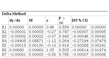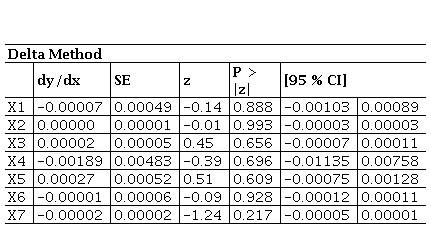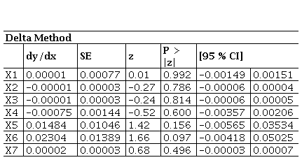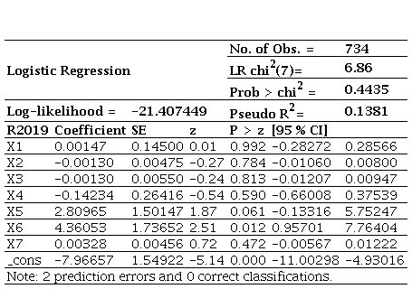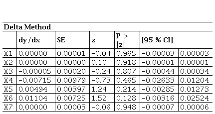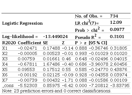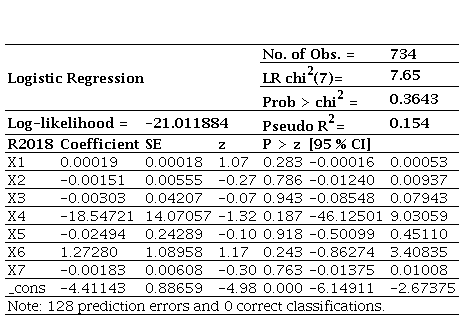 Source: Own work.The marginal effects for 2021 indicate that, although there are variations in the probability of insolvency associated with each variable, these are not sufficiently robust to be considered predictive. Specifically, marginal decreases are linked to increases in X1, X3, X4, and X7 (-0.0000006, -0.0000484, -0.0071462, and -0.00000208, respectively), while increases are linked to X2, X5, and X6 (0.000000342, 0.004939, and 0.0110379, respectively). These variations suggest possible trends, but their significance levels (P = 0.965, 0.807, 0.465, 0.214, 0.128, and 0.948) reveal limited statistical robustness. These results are consistent with earlier models, both in terms of the lack of statistical significance and the small magnitude of marginal effects.