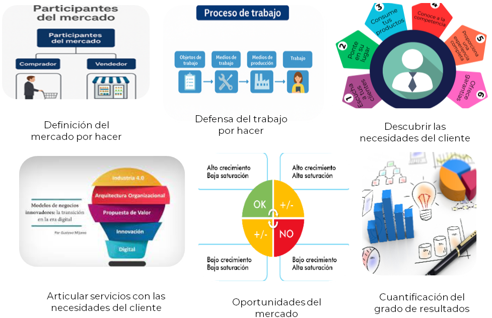 Fuente: Christensen et al. (2016).El modelo Jobs to Be Done se destaca en diferentes procesos de gestión comercial que involucran el incremento de la cuota de mercado o el posicionamiento de la oferta con oportunidades existentes que aumentan la rentabilidad de la empresa, cambiando la forma de empatizar con los clientes, haciendo el trabajo con menor esfuerzo, lo cual se logra con la optimización del recurso humano para fortalecer la cartera de productos y servicios. Con respecto a los componentes, al definir el mercado, este debe hacerse de manera que perdure en el tiempo, permitiendo que las estrategias adquieran un mayor valor. Así, se indaga en las necesidades insatisfechas de los consumidores a partir de un punto focal que permita identificarlas, lo cual contribuirá a centrar la generación de valor con los resultados financieros y la identificación efectiva de inversiones clave para el adecuado funcionamiento de la empresa. La defensa del trabajo por hacer puede constituirse como una de las actividades más complejas del modelo, pues la estrategia debe fijarse solo en lo que hace el producto por el cliente, definiendo las variables que hagan al trabajo funcional, y generando pautas para poner en práctica la teoría de los «trabajos por hacer». Para ello, debe diseñarse un mapa de trabajo que explique detalladamente lo que se requiere para suplir las necesidades de los clientes, definiendo así una visión clara de la solución que haga todo el trabajo.