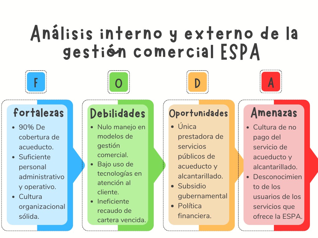 A continuación, en la Figura 2, se ilustran las fortalezas, oportunidades, debilidades y amenazas (FODA) de la ESPA, a partir del análisis de su gestión comercial.