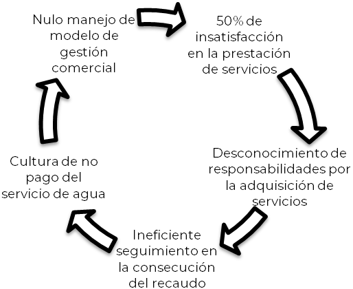 El estado actual de la prestación de servicios que ofrece la Empresa de Servicios Públicos de Aguachica (Timmers, 1998) refleja una prestación de servicio de acueducto con cobertura total urbana y servicio de alcantarillado al 76 % de cobertura, con ineficiente seguimiento en la consecución del recaudo y deficientes niveles de medición en el abastecimiento urbano por la carencia de medidores en diferentes puntos de los 11 sectores que componen la localidad. Su prestación del servicio está amparada en el Concepto Normativo 20230120069161 de la Comisión de Regulación de Agua Potable y Saneamiento Básico (CRA, 2023). Por otro lado, se observa una significativa cultura de no pago del servicio, además de desconocimiento en el procedimiento de la prestación del servicio por parte de los usuarios, incluyendo la poca divulgación de alternativas de pago y estrategias para pagos oportunas de facturas vencidas.
