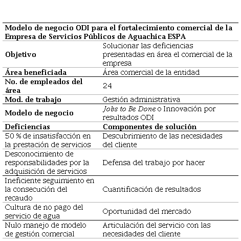 Resultados: los hallazgos permitieron identificar deficiencias en la facturación de servicios de acueducto y alcantarillado, en la recuperación de cartera, en la socialización de servicios integrales a los suscriptores y en la deficiencia de medidores en el 32 % de los predios del municipio. Se señala la insatisfacción por los servicios ofrecidos por la ESPA, y una ineficiente gestión comercial. Se utilizó el modelo de negocio Jobs to Be Done por sus variables métricas basadas en rasgos cualitativos y cuantitativos que permitieron su desarrollo desde un proceso de seis componentes para fortalecer las principales deficiencias encontradas.