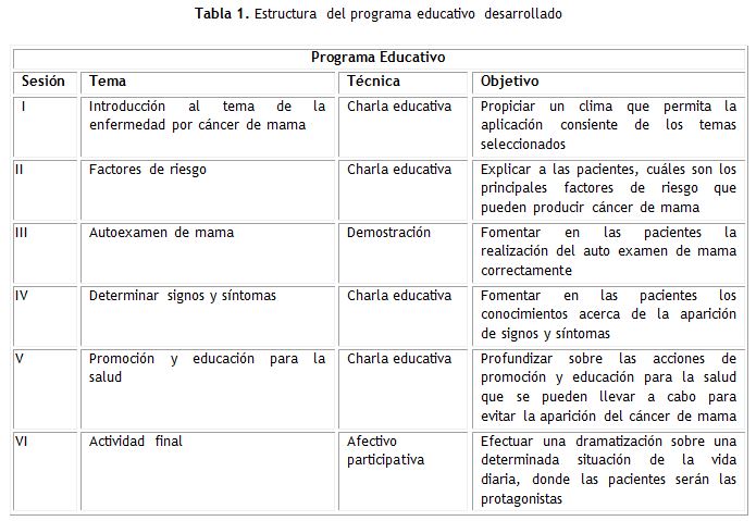 En la etapa II o de intervención, una vez identificadas las necesidades de aprendizaje sobre el tema se realizó una intervención educativa para elevar el nivel de información sobre los FR del cáncer de mama. Se prepararon seis encuentros en los que se incluyeron los diferentes temas de interés con una hora de duración para cada uno, con una frecuencia de una vez por semana por un espacio de seis semanas, fueron diseñados de acuerdo con el diagnóstico inicial y los resultados obtenidos (tabla 1). Las 24 pacientes participaron activamente en la intervención proyectada. Se aplicaron un conjunto de técnicas que hicieron viable y efectiva la participación de la población (charlas educativas, la demostración y técnicas afectivas participativas).