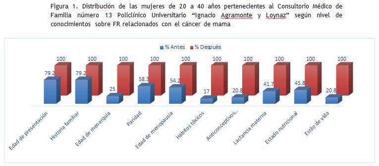 Se encontró que, tras la intervención, en todas las temáticas relacionadas con los FR del cáncer de mama, los niveles de conocimientos evaluados como adecuados se elevaron (figura 1).
