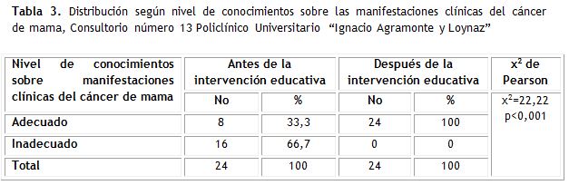 Se encontró que antes de la intervención el 66,7 % de las encuestadas no tenían pleno conocimiento acerca de las manifestaciones clínicas del cáncer de mama, lo cual se revirtió al finalizar el programa educativo.