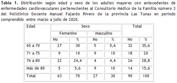 Al analizar los adultos mayores con antecedentes de enfermedades cardiovasculares, se encontró predominio del sexo femenino (70 %) y el grupo de edades de 65 a 70 (35,6 %) (Tabla 1).