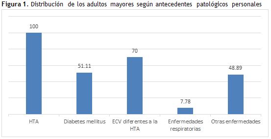 EL 100 % de los adultos mayores según antecedentes patológicos personales fueron hipertensos, y el 70 % presentó enfermedades cardiovasculares diferentes a la HTA (figura 1).