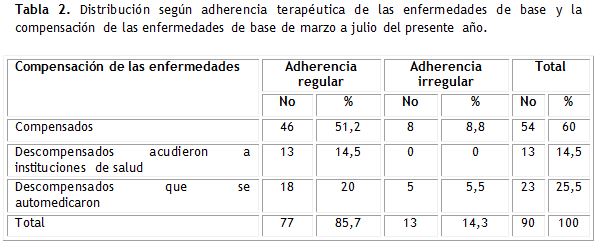 El 85,7 % de los pacientes mantuvo una adherencia terapéutica regular a los tratamientos de las enfermedades de base. El 60 % de los pacientes se mostró compensado en el periodo de estudio (tabla 2).