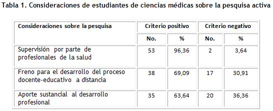 El 96,36 % refirió que la labor de pesquisa activa fue supervisada por profesionales de la salud. El 69,09 % de los estudiantes refirió que la pesquisa constituye un freno para el desarrollo del proceso de educación a distancia, y el 36,36 % expuso criterios negativos sobre el aporte de la pesquisa al desarrollo profesional (tabla 1).