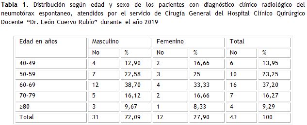 Methods: an observational, descriptive and cross-sectional study was carried out in 43 patients with clinical radiological diagnosis of spontaneous pneumothorax, treated at the “Dr. León Cuervo Rubio ” Hospital during 2019. Descriptive statistics were used, and bioethical principles were met.