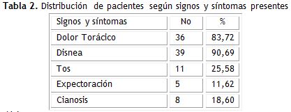 Al estudiar los signos y síntomas, se encontró que el 90,69 % presentó disnea y el 83,72 % presentó dolor torácico (tabla 2).