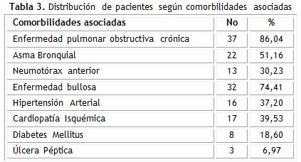 Se encontró predominio de pacientes con antecedentes de enfermedad pulmonar obstructiva crónica (86,04 %), y enfermedad bullosa (74,41 %) (tabla 3).