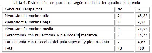 El 48,83 % de los pacientes fueron tratados con pleurostomía mínima alta y el 20,93 % con pleurostomía mínima media (tabla 4).