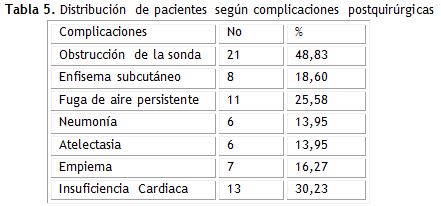 Al analizar las complicaciones postquirúrgicas, el 48,83 % presentó obstrucción de la sonda, y el 30,23 % insuficiencia cardiaca (tabla 5).