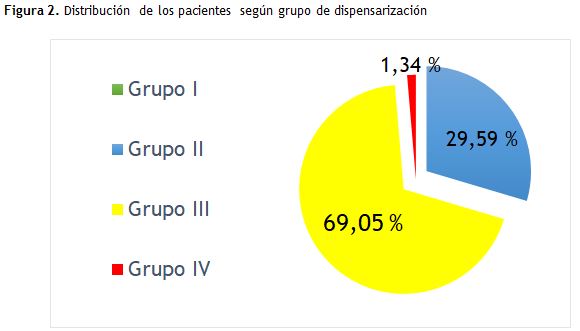 El grupo de dispensarización predominante fue el III (enfermos) con un 69,05 % del total de la población estudiada (figura 2).