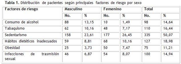 El principal factor de riesgo fue el sedentarismo (50,07 %) con un 23,61 % en los hombres y 26,45 % en las mujeres (tabla 1).