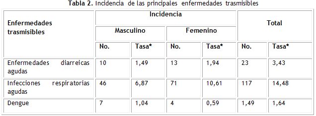 Predominaron las infecciones respiratorias agudas con una tasa de 14,48 por cada 100 habitantes (tabla 2).