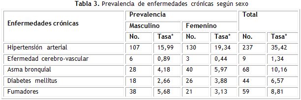 La hipertensión arterial (237 pacientes) y el asma bronquial (68 pacientes) constituyeron las enfermedades crónicas no transmisibles con mayor incidencia, con tasas de 35,42 y 10,16 por cada 100 habitantes respectivamente (tabla 3).
