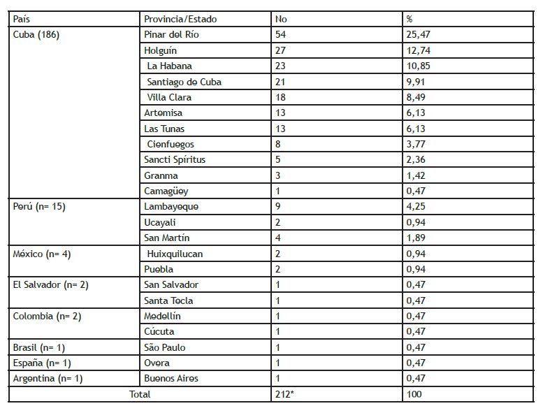 Durante el año 2020, se recogió un total de 211 autores en los artículos, de ellos el 12,26 % foráneos. Se observaron 11 artículos con contribuciones interprovinciales (18,33 %) y 2 con contribuciones internacionales (3,33 %). La distribución por país y provincias o estados se observa en la tabla 1.