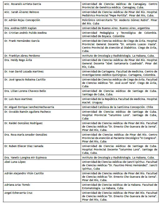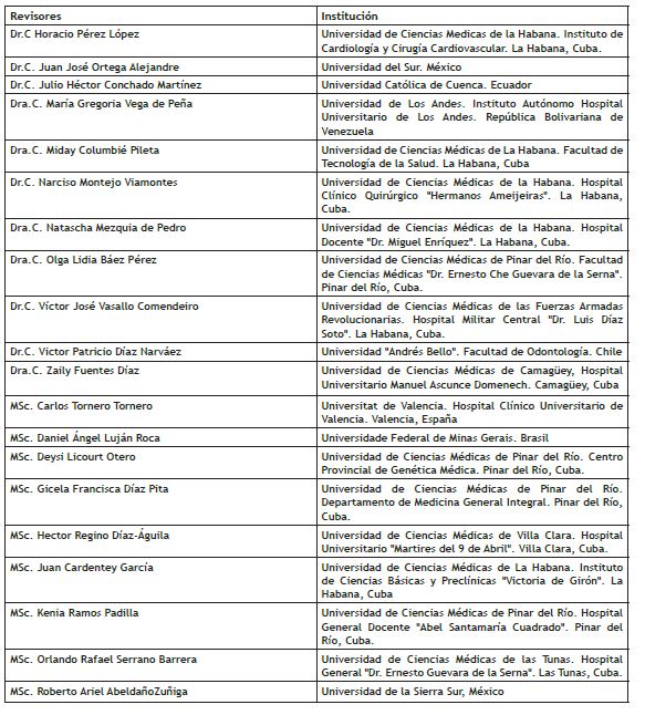 Durante el 2020, la evaluación de los artículos fue desarrollada por 56 revisores (tabla 2), de ellos, el 21,43 % fueron extranjeros y el 26,78 % pertenecen a la Universidad de Ciencias Médicas de Pinar del Río. De los revisores, 18 fueron estudiantes de las Ciencias Médicas (32,14 %), 16 fueron profesionales sin maestrías o doctorados (28,58 %), 11 poseían doctorados (19,64 %) y11 maestrías (19,64 %). A los revisores nuestro más sincero agradecimiento y reconocimiento, por su aporte a la calidad de la revista en momentos convulsos como los actuales.