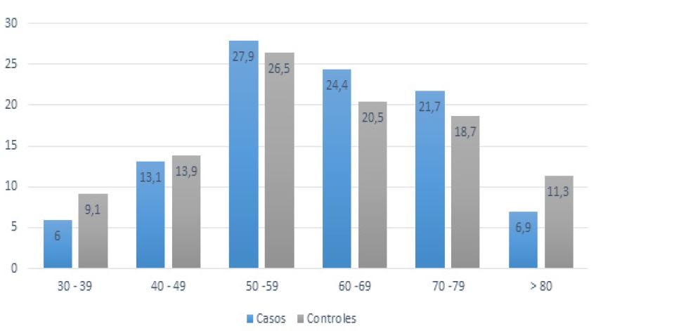 Tanto en los casos (27,9 %) como en los controles (26,5 %) predominó el grupo etarios de 50 a 59 años de edad (figura 1).