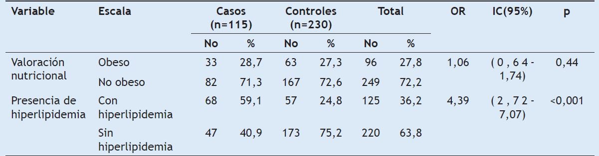 Al analizar la valoración nutricional, se encontró predominio de pacientes no obesos tanto en los casos (71,3 %) como en los controles (72,6 %). La hiperlipidemia se encontró en el 59,1 % de los casos, y en el 24,8 % de los controles. Se encontró asociación entre la presencia de hiperlipidemia y el desarrollo de un IMA, se encontró asociación estadística entre estas variables (<0,001), representando un factor de riesgo cardiovascular (OR: 4,39 IC: 2,72-7,07).
