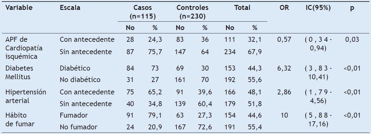 Methods: an observational, analytical case-control study was conducted. The target group consisted of 345 patients, all of them were studied. Absolute frequency and relative percentage were used. The chi-square test of independence and the odds ratio with its 95 % confidence interval were applied to determine the association between variables.